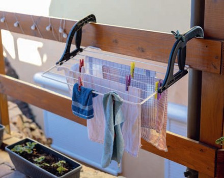 Latem balkony i tarasy stają się suszarniami. Oczywiście możemy rozciągnąć sznurki między krańcami balustrady, jednak takie rozwiązanie nie jest zbyt estetyczne i praktyczne – linki zabierają przestrzeń, nawet gdy nic na nich nie wisi. Na balkonie czy tarasie sprawdzą się składane suszarki typu wieża. Umożliwiają maksymalne wykorzystanie przestrzeni, są pojemne, a przy tym zajmują niewiele miejsca. Ponadto dzięki regulowanym półkom bez problemu wysuszymy ręczniki, pościel czy koszule. Niektóre modele wyposażone są np. w wieszaki na uchwyty. Co ważne, gdy zapowiadają silny wiatr, unikajmy wieszania prania na tych suszarkach, ponieważ podmuchy mogą je przewrócić. Jeśli nasz balkon jest wyjątkowo mały – a takich nie brakuje – to dobrym wyborem może okazać się suszarka wieszana na poręczy lub mocowana do ściany. Po sezonie możemy ją zdemontować i zabezpieczyć przed zabrudzeniami oraz korozją.