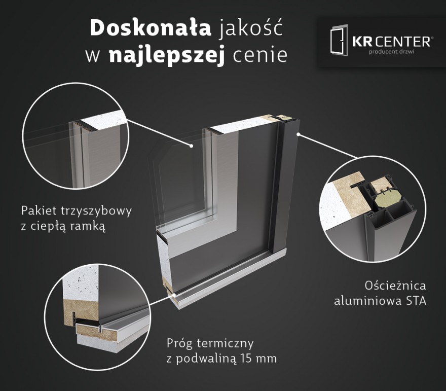 Pomysł na drzwi zewnętrzne metalowe z aluminiowymi ościeżnicami zrodził się z pasji i dążenia do perfekcji pracowników KR Center. Drzwi KR Center to kompleksowe rozwiązanie całego zamknięcia otworu wejściowego. Stolarka drzwiowa obejmuje zarówno samo skrzydło, jak i konstrukcję ościeżnicy dopasowanej do niego technologicznie.