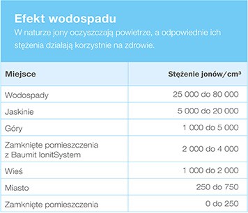 Niestety w zamkniętych pomieszczeniach stężenie jonów jest zazwyczaj bardzo niskie i nie przekracza 250 na cm³. Z punktu widzenia odpowiedniej jakości powietrza ta liczba powinna być przynajmniej cztery razy większa. Dobra wiadomość jest taka, że może taka być – i to bez dodatkowych urządzeń generujących hałas i zużywających prąd! Szczególnie, gdy stajemy przed wyzwaniem wykańczania ścian betonowych czy gipsowo-kartonowych lub remontem starych podłoży. Wystarczy farba do ścian Baumit IonitColor, wykorzystująca mechanizmy występujące w naturze oraz masa szpachlowa regulująca wilgotność powietrza Baumit IonitFinish lub Baumit IonitFino, by zwiększyć ilość dobroczynnych jonów nawet do 2000-4000 na cm³ i uzyskać jakość powietrza porównywalną do tej, której możemy doświadczyć, spacerując po lesie, brzegiem morza czy chodząc po górach.