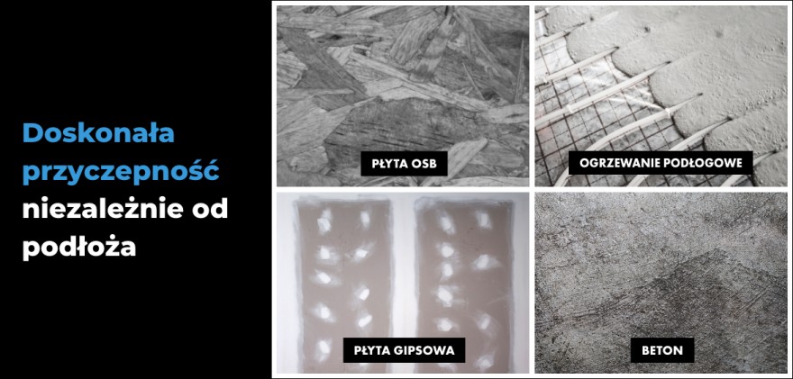 - doskonały rozpływ, szczególnie istotny na podłogi, tarasy, balkony, ogrzewanie podłogowe