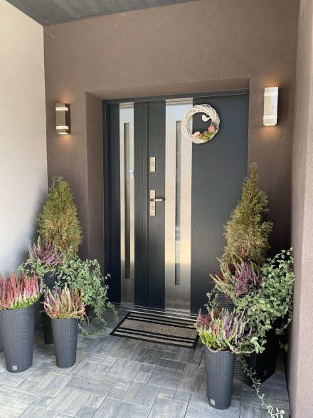 Kolejnym elementem zapewniającym nie tylko estetykę ale także i bezpieczeństwo, jest oświetlenie wejścia do budynku oraz elewacji. O ile przy samych drzwiach można zainstalować oprawy z czujnikiem ruchu, aby wzmocnić oświetlenie podchodząc do nich, o tyle oświetlenie elewacji musi być zaaranżowane całościowo. Nie znaczy to, że musi być monotonne i w każdym miejscu na jednakowym poziomie. Trzeba umiejętnie oświetlić elewacje delikatnym światłem w miejscach gdzie bryła budynku jest jednolita, i dodatkowo podkreślić szczegóły architektoniczne charakterystyczne dla wybranego stylu budowli. Bardzo popularnym rozwiązaniem jest oświetlenie dookólne domu z opraw zamontowanych w tzw. podbitce, świecących w dół wzdłuż elewacji najczęściej między otworami okiennymi. Przeciwstawnym rozwiązaniem jest oświetlenie elewacji realizowane oprawami zamontowanymi na poziomie ziemi (KROMA LED IP65, TABLET LED IP65) lub wkopanymi w grunt (GAWRA LED IP67). Oba te sposoby mogą być z łatwością zrealizowane nawet, jeśli nie została na etapie budowy zaprojektowana instalacja zasilająca oprawy zewnętrzne budynku. W łatwy sposób można ją doprowadzić do zaplanowanych miejsc już po zakończeniu budowy.